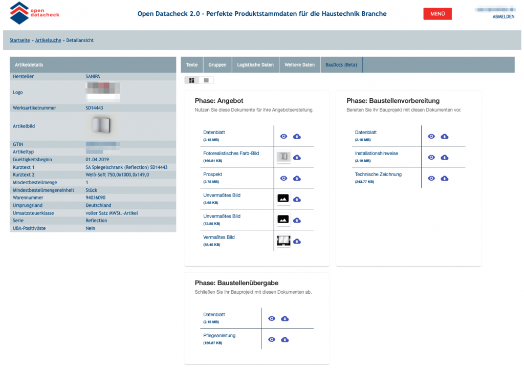Die Integration von BauDocs in Open Datacheck ist nun durchgeführt. Eine neuer Tab in der Artikel-Detailansicht zeigt ab sofort alle zugeordneten Baudokumente je Artikel.